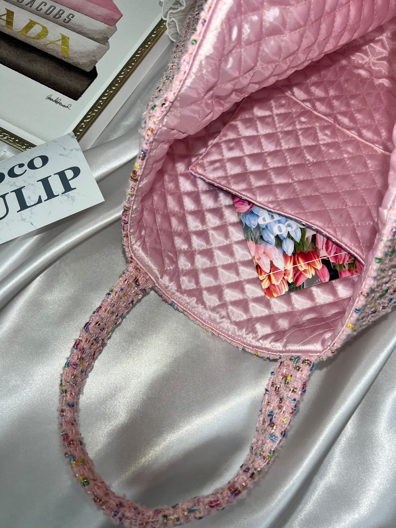 ふんわり可愛いキルティング素材もサテンキルティングにすることで華やか。