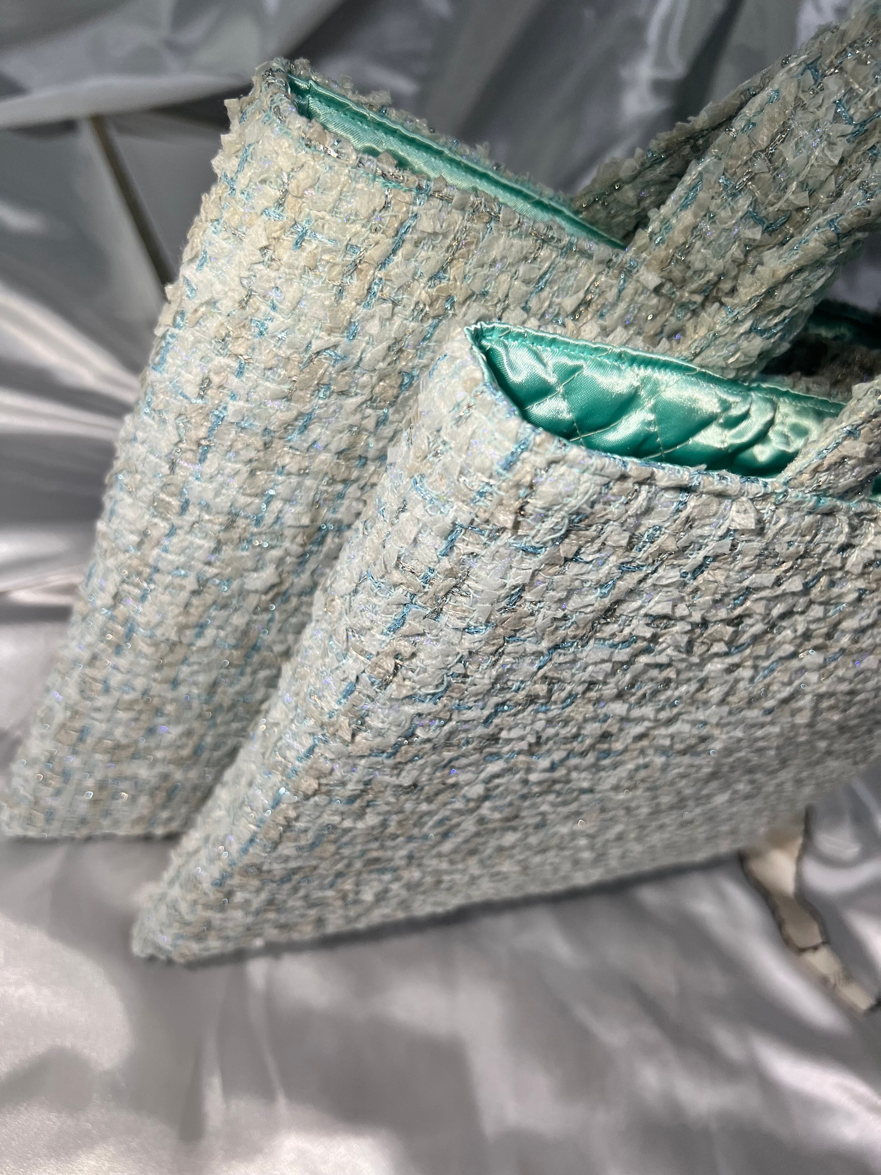グリーン系とグレージュのリボンにグリーンのキラキラ糸が織り込まれている、大人綺麗系なファンシーツイードです。裏地はミントグリーンで可愛いさプラスしています!