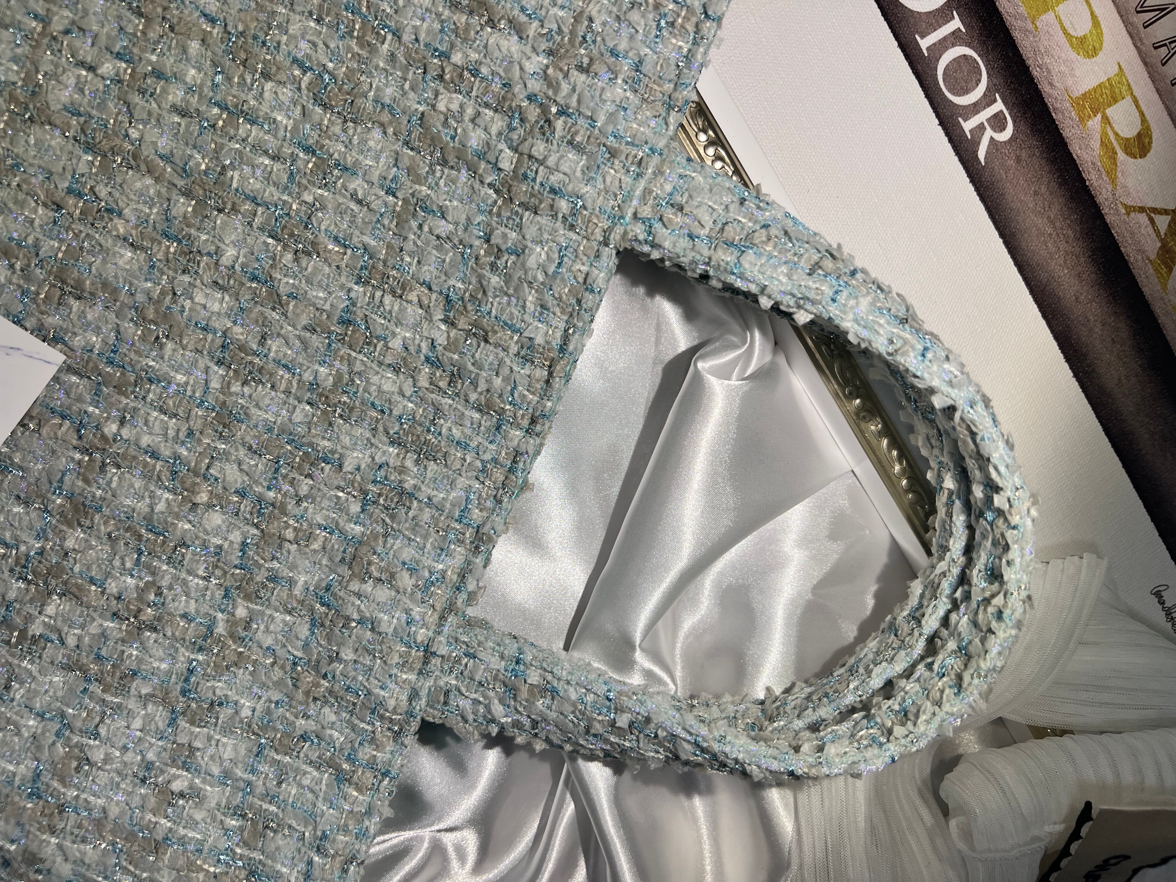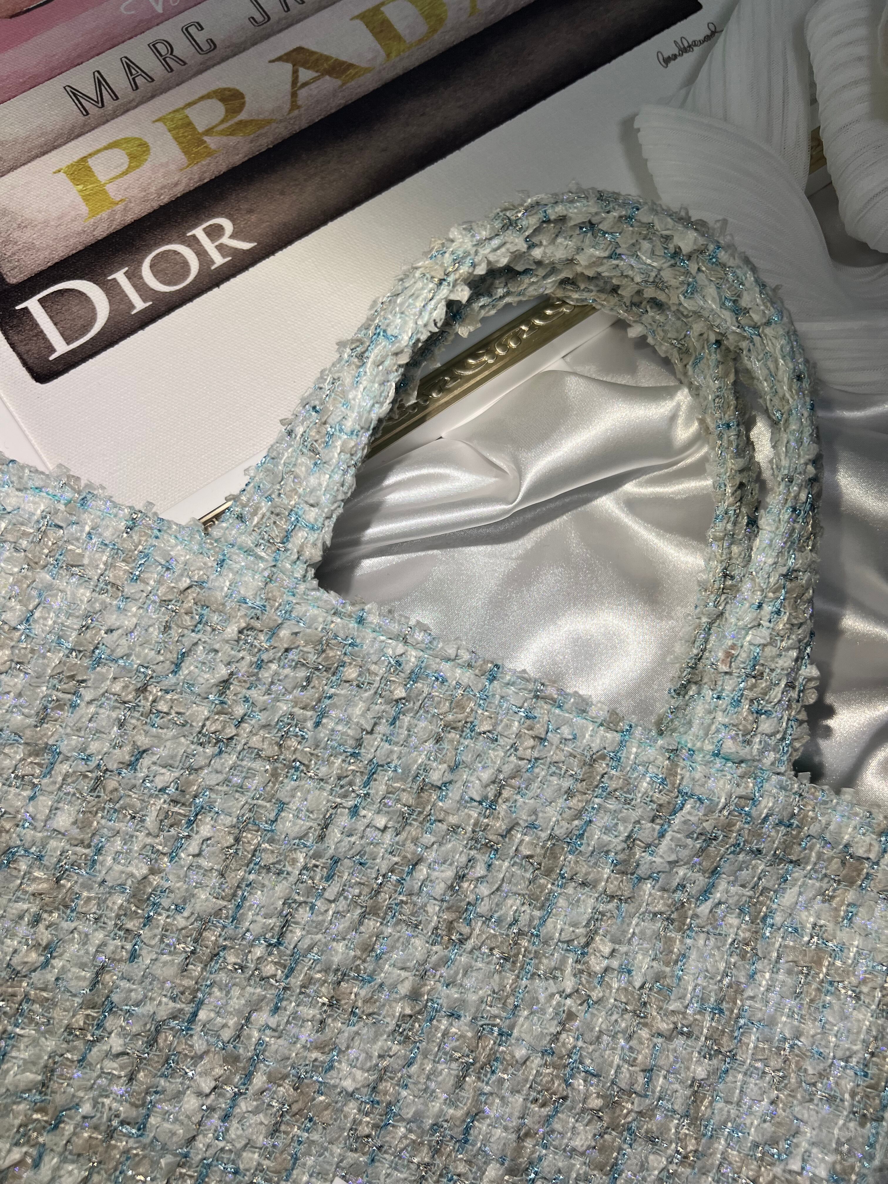 グリーン系とグレージュのリボンにグリーンのキラキラ糸が織り込まれている、大人綺麗系なファンシーツイードです。裏地はミントグリーンで可愛いさプラスしています!
